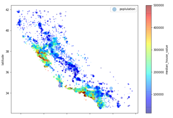 c="median_house_value", cmap=plt.get_cmap("jet"), colorbar=True,)
