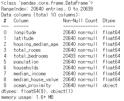 중간값이 수치형 특성에서만 계산 가능하므로 object형인 ocean_proximity를 제외한 복사본 생성