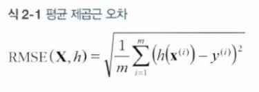 - 회귀 문제의 전형적인 성능 지표 -> 평균 제곱근 오차 (root mean square error, RMSE)