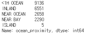 - object 형인 ocean_proximity에 어떤 종류의 객체가 존재하는지 확인