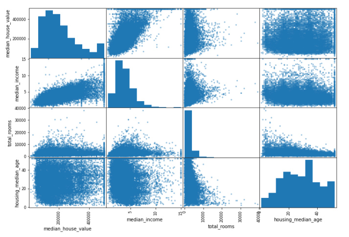 (+ 각 변수들의 상관관계를 직관적으로 확인할 수 있다. ex. median_income와 median_house_value 은 선형적인 관계를 띄고 있다.)