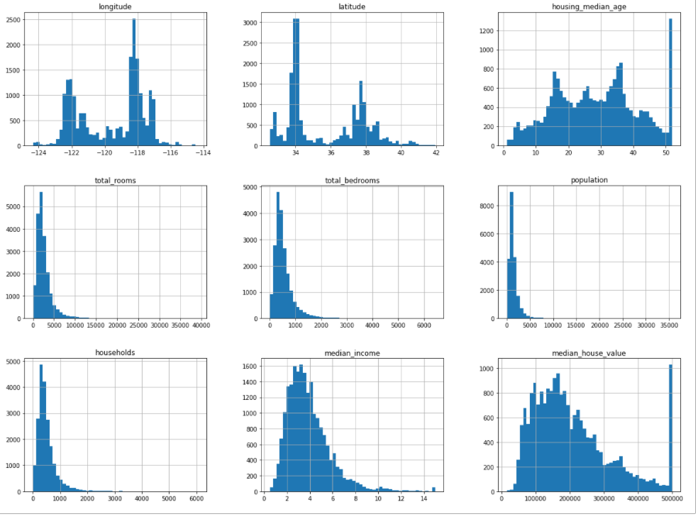 2. 중간 주택 연도(housing median age) & 중간 주택 가격(median house value) 최댓값 한정시킴 --> 해당 구역 제거 or 구역 이외의 데이터도 수집